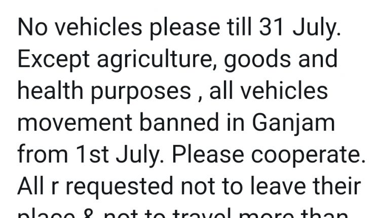 ଜୁଲାଇ ୩୧ ପର୍ଯ୍ୟନ୍ତ ଗଞ୍ଜାମରେ ଯାନବାହନ ଚଳାଚଳ ଉପରେ ରୋକ୍ ଲଗାଇଲା ଜିଲ୍ଲା ପ୍ରଶାସନ, ଟ୍ୱିଟ଼୍ କରି ସୂଚନା ଦେଲେ ଜିଲ୍ଲାପାଳ।