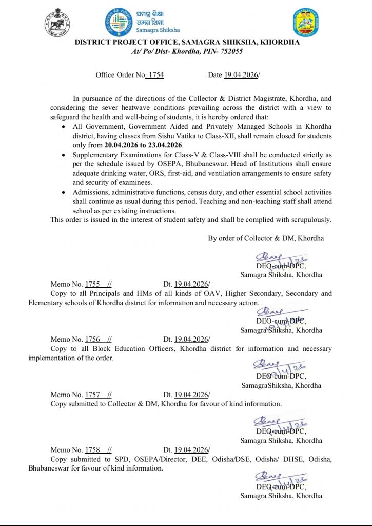 ଖୋର୍ଦ୍ଧା ଜିଲାରେ ସମସ୍ତ ସ୍କୁଲ ଓ ଅଙ୍ଗନଓ୍ବାଡ଼ି କେନ୍ଦ୍ରକୁ ଛୁଟି ଘୋଷଣା କରାଯାଇଛି। ଅସହ୍ୟ ଖରାକୁ ଦେଖି ୨୦ରୁ ୨୩ ପର୍ଯ୍ୟନ୍ତ ଛୁଟି ପାଇଁ ନିର୍ଦ୍ଦେଶ ଦେଇଛନ୍ତି ଖୋର୍ଦ୍ଧା ଜିଲାପାଳ ଅମ୍ରିତ ଋତୁରାଜ। ଜିଲାର ସମସ୍ତ ସରକାରୀ ଓ ବେସରକାରୀ ସ୍କୁଲ ବନ୍ଦ ରଖିବାକୁ ଜିଲାପାଳ ନିର୍ଦ୍ଦେଶ ଦେଇଛନ୍ତି।