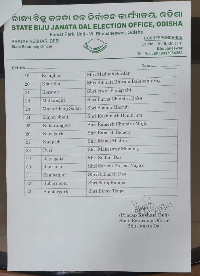 ବିଜେଡ଼ି ର ଜିଲ୍ଲା ସଭାପତିଙ୍କ ନାମ ଘୋଷଣା ୧୯ ନୂଆ ୧୪ ପୁରୁଣା ମୁହଁ ରାଜନୀତି By Laxmanarekha News Last updated Feb 21, 2020 190 0 ଭୁବନେଶ୍ୱର.(LR News21/2 ରସ୍ନା ରାଣୀ ହରିଚନ୍ଦନ) ବିଜେଡ଼ି ୩୩ ଟି ସାଙ୍ଗଠନିକ ଜିଲ୍ଲା ସଭାପତିଙ୍କ ନାମ ଘୋଷଣା ହୋଇଛି ୧୯ ନୂଆ ୧୪ ପୁରୁଣା ମୁହଁ 0 190 Share FacebookTwitterWhatsappEmailGoogle+